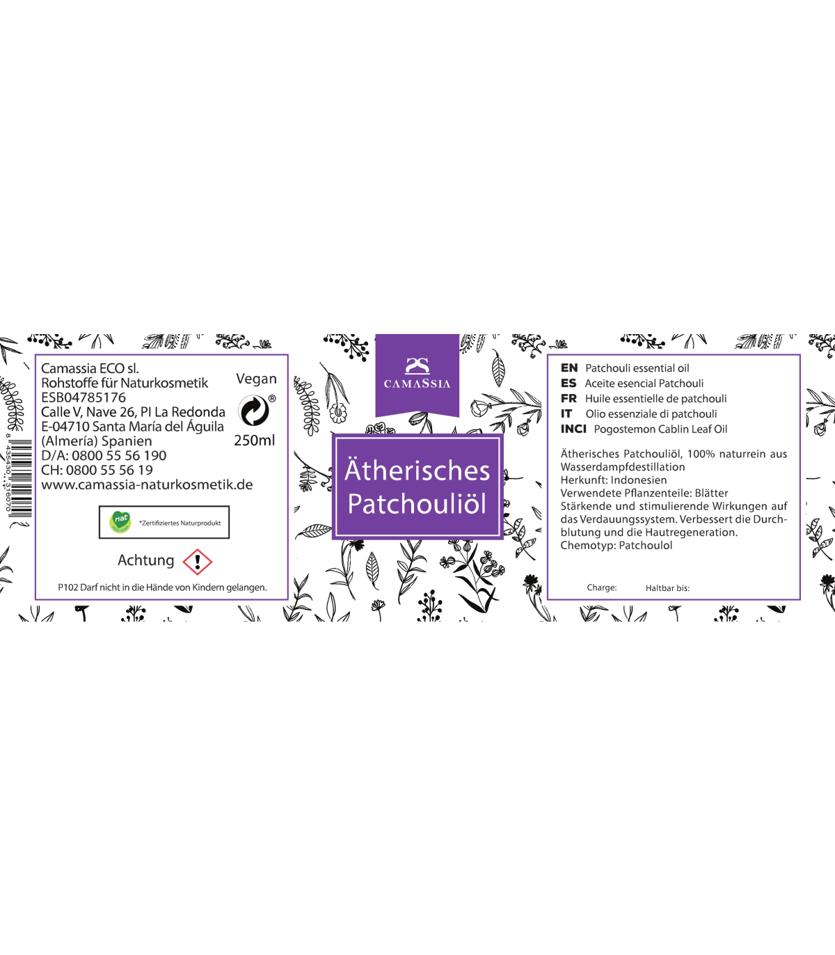 Patchouliöl wirkt vitalisierend und stimuliert das Verdauungssystem. Außerdem regt es die Durchblutung an und regeneriert die Haut.