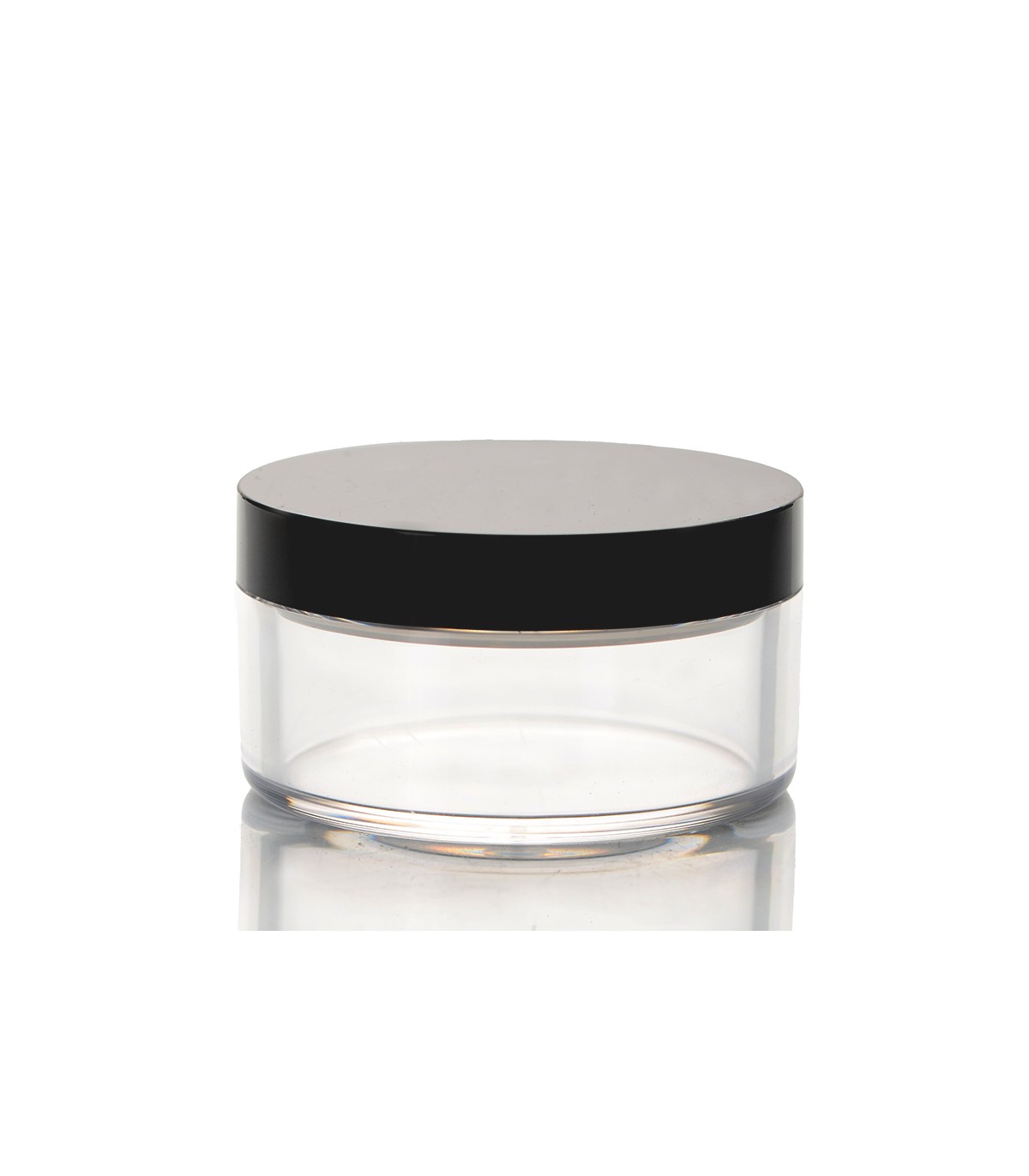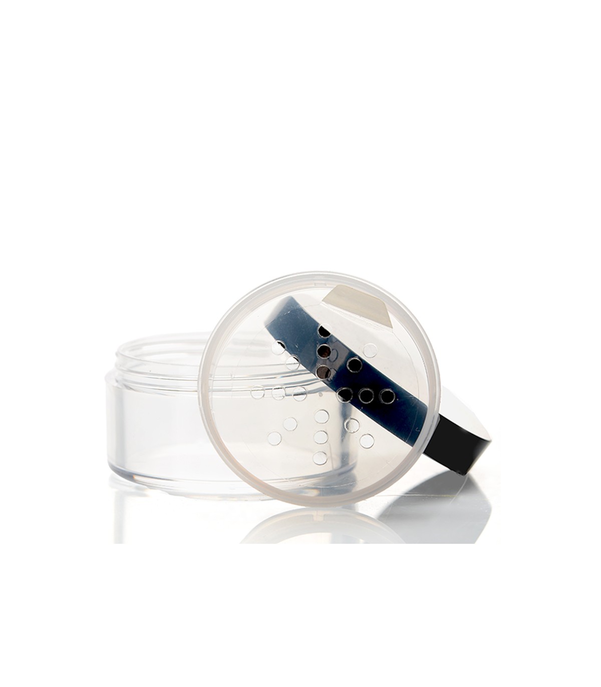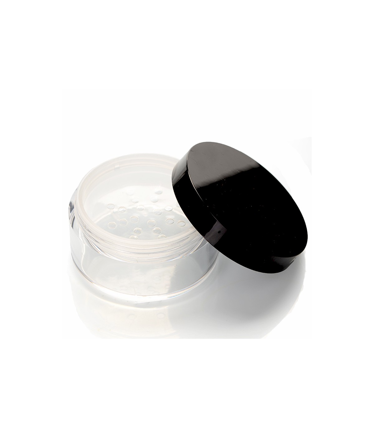Puderdose aus Polystyrol mit schwarzem Deckel. Innendeckel mit Löchern, um Gesichtspuder einfacher zu dosieren.