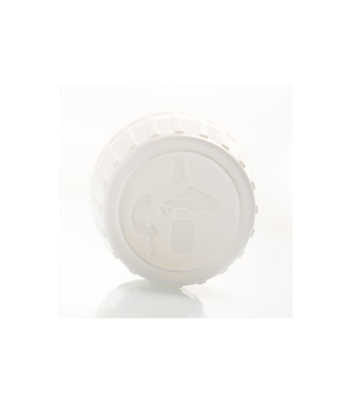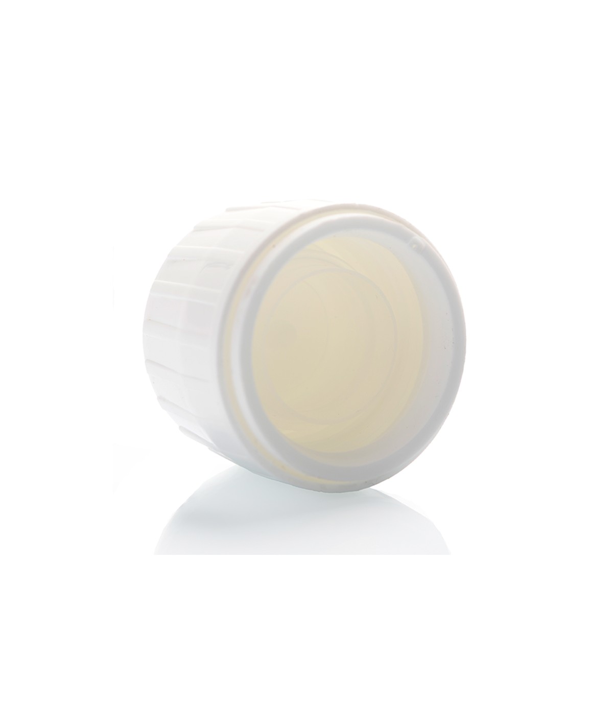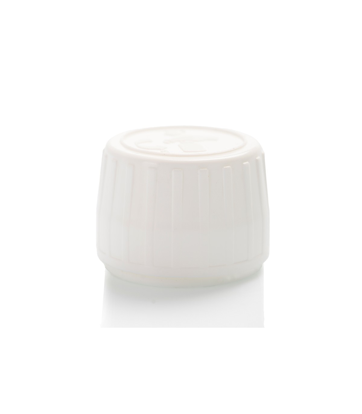 Weißer Schraubverschluss für Flaschen mit einem 28-mm-Gewinde, inklusive Tropfeinsatz und kindersicherem Verschluss.