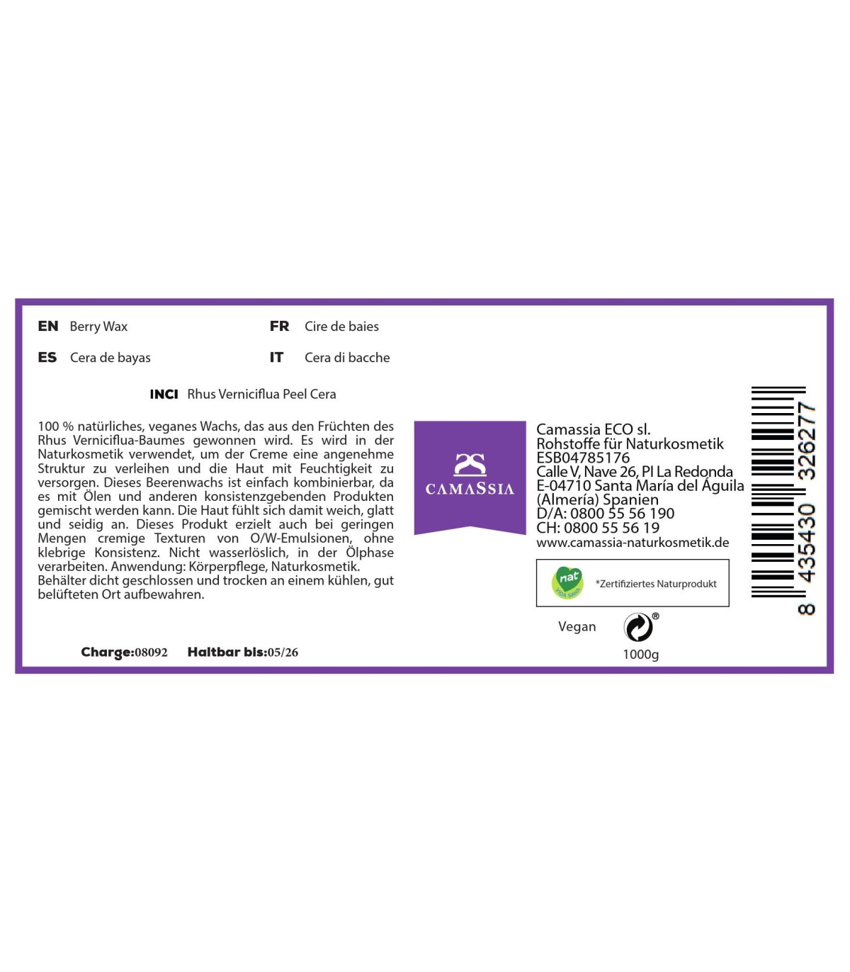 Beerenwachs (Berry Wax) ist ein 100 % natürliches, veganes und vegetarisches Wachs, das aus den Früchten des Rhus Verniciflua-Baums gewonnen wird. Es wird in der Naturkosmetik verwendet, um eine feine, weiche Struktur zu erzeugen und die Haut zu pflegen und zu rehydrieren. Zudem wirkt es leicht koemulgierend und konsistenzgebend. Dieses Wirkstoffwachs lässt sich hervorragend mit Ölen und anderen fetthaltigen Inhaltsstoffen kombinieren.